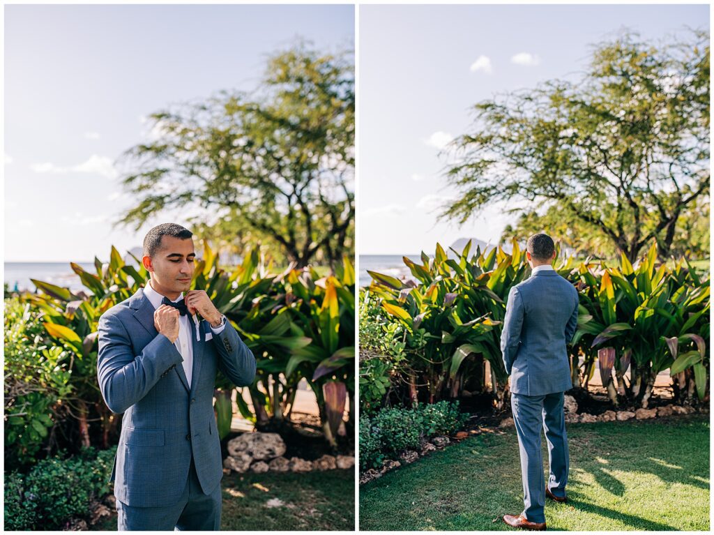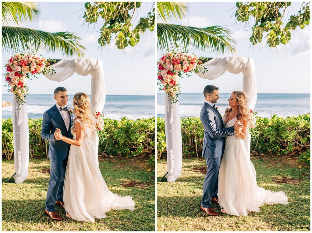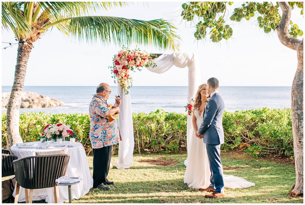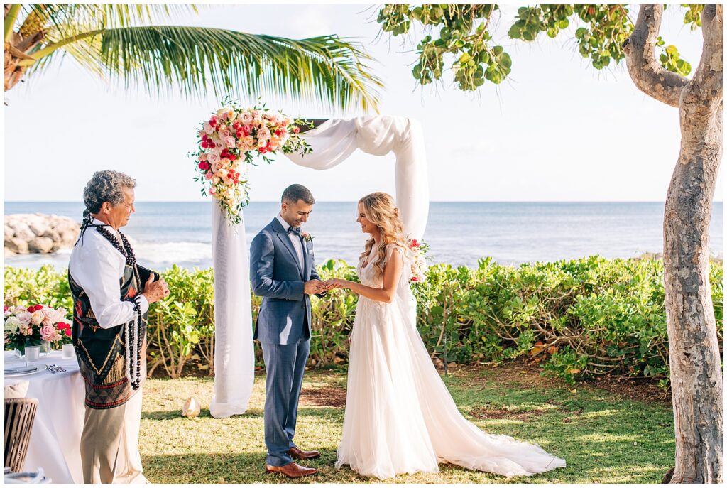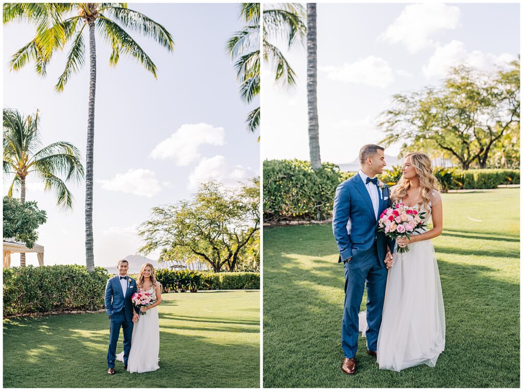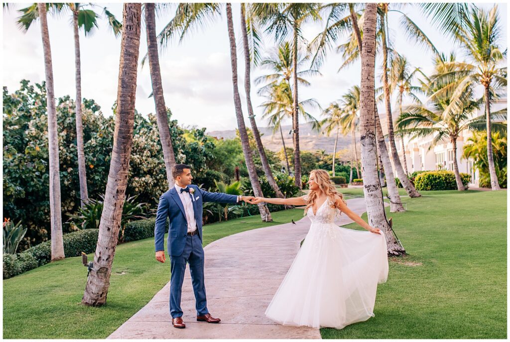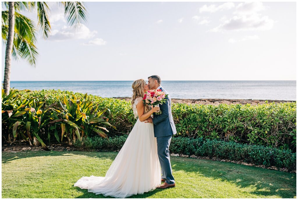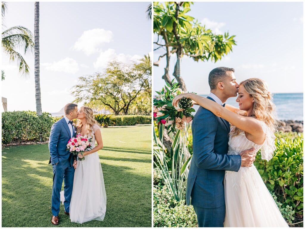 This Four Seasons Resort Elopement was so beautiful to capture and be apart of. I have always wanted to photograph a wedding at the four seasons and I’m so glad that I can now check that off as done. This wedding was very intimate and special for them. It was only those two for the ceremony and I always love when you get to really focus on the time between you and your partner and not worry about the rest of the crazy wedding stuff. We started out with the first look on the grass and it was so special to see that for them. They wanted to get some photos of them before the ceremony, so we went to this special spot that they loved, and got some pictures there. The ceremony was just about to start, so we headed too the area where they were getting married. There was the officiant under the alter waiting and someone singing while playing the ukulele. They got to share their first kiss as husband and wife and couldn’t of been more happier. We ended the night taking photos around the resort at some spots that they wanted photos with. The sun was almost fully set and so we ran out to the beach for last minute beach sunset photos. I was happy to have been apart of this beautiful day.